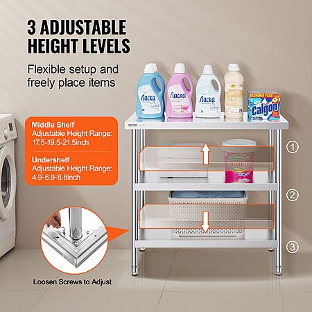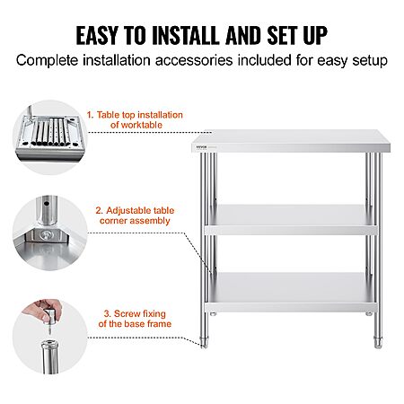 Amazon.com. has VEVOR Stainless Steel Food Prep Table, 18 x 36 x 34 Inch Commercial Kitchen Worktable, with 2 Adjustable Undershelf, Heavy Duty Prep Metal Work Table for BBQ, Kitchen, Home, and Garage on sale for $86.86. Shipping is Free.