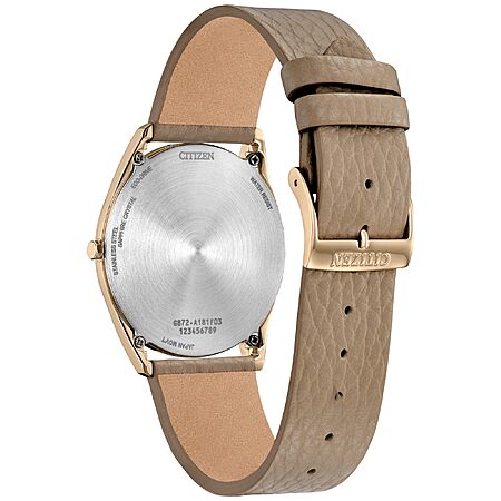 - Is secured to the wrist via a grained beige leather strap with buckle closure.