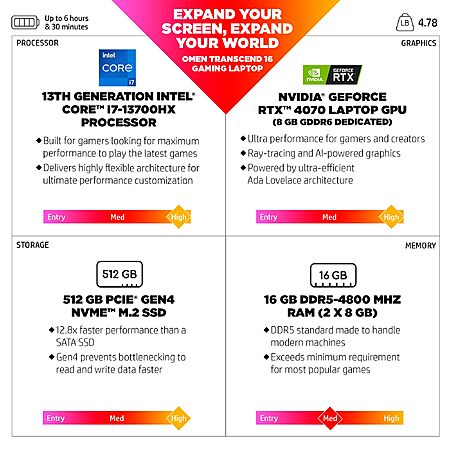 HP OMEN Transcend 16 inch Laptop Bundle, WQXGA 240Hz Display, 7ms Response Intel Core i7-13700HX, 16 GB RAM, 512 GB SSD, NVIDIA GeForce RTX 4070 GPU (8 GB) $999.45