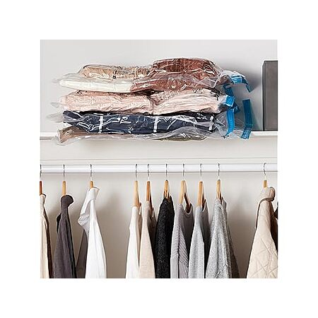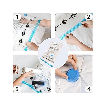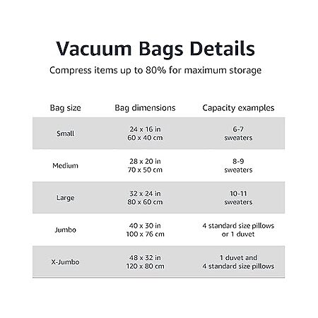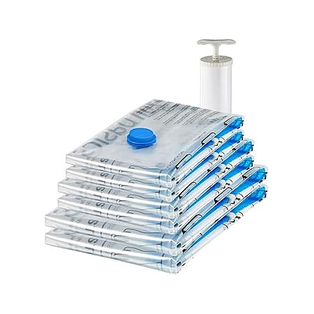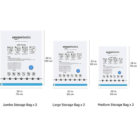 $10.99*:Amazon Basics Multiple Vacuum Compression Zipper Storage Bags for Space Saving and Travel with Hand Pump, 6-Pack (2 Jumbo, 2 Large, 2 Medium), Transparent