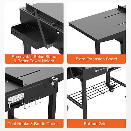| Product Description: | Check Out Our Customer Favorites: 3 Burner 23'' Propane Gas Griddle with with Lid – Limited Stock, Act Fast! 3 Burners 32'' Propane Gas Griddle Foldable– Limited Stock, Act Fast! 11*8 ft Volleyball Training Net Adjustable Height– Limited Stock, Act Fast! Elevate your outdoor cooking experience with the WARMOUNTS Adjustable Grill Table! Designed to fit grills from 11" to 24", this versatile outdoor grill table offers a customizable, steady cooking station for gas griddles, pizza ovens, and more. Built with thickened stainless steel and non-slip legs, the grill tables for outside supports up to 400 lbs, ensuring stability on any terrain. The foldable design makes setup and storage a breeze, ideal for camping, tailgating, or RV trips. With 360° lockable wheels, moving the outdoor grill cart with wheels is effortless. Enjoy added convenience with removable accessories like a condiment caddy, tool hooks, and an extension board for extra workspace. Whether you're grilling outdoors or organizing indoors, this multi-functional outdoor grill cart is your ultimate companion for adventure and efficiency! Key Features: 【Adjustable Length Design for Different Grills】 WARMOUNTS outdoor grill table(size: 37.56"x17.3"x34.65") is designed to accommodate grills of different sizes. With an adjustable length feature, customizing the length of tabletop to fit different grill, keeping it steady on top and providing a stable and secure cooking station. If you don't need it, you can remove it to get more space. The portable BBQ cart accommodates min 11" to max 24" gas griddle, table top grill, pizza oven, weber grill ect. 【Sturdy & Stable Construction】 Made of thickened stainless steel to ensure more enduring and easy cleaning. Equipped with upgraded sturdy non-slip legs and thickened rubber wheels, the outdoor grill cart has a load capacity of up to 400 LBS. With a lockable mechanism, the grill tables for outside can remain stable even on uneven ground. Whether you are at a campsite or on the lawn, it will ensure that your grill is firmly fixed to the tabletop without shaking. 【Easy Folding & Storage 】 Folding grill table features a convenient folding design that folds down to a compact size, similar to a suitcase. No tools required, it takes only 20 seconds to set up, and easily stores in the vehicle or carried to your next outdoor adventure. Simple, convenient setup so you can start grilling in no time! 【360° Flexible to Move 】 The outdoor grill cart with wheels is equipped with 4 metal rubber wheels, more flexible to move than other grill table with 2 wheels. 2 of them are universal wheels with locking, can rotate 360 degrees, allowing for maximum flexibility and convenience when moving. The wheels with locking devices to secure the grill cart in place, ensuring stability and safety during use. Designed for convenience, reliability and style, our outdoor grill table is the companion for your backyard barbecues, tailgates, or camping adventures. 【Versatile Storage Space】 Portable Grill Table has an removable side mounted condiment caddy, paper towel holder, extra extension board, bottom grid, bottle opener and 5 stainless steel tool hooks to provide extra space for storing brushes or spoons, and a way to keep your grilling tools within reach. Additional storage space for convenience and better organization. Take your outdoor cooking to the next level with this BBQ Grill Table! 【Multi-Functional Grill Cart】 The extra extension side table of the bbq cart offers more space to easily store more ingredients and cookware. Use it as a prep station to organize ingredients, spices, utensils, and napkins. In addition, it is not only an outdoor cooking table, camping table, BBQ table, food pre table outdoors, but also be used as a mobile workbench and storage rack indoor. Why Choose Our Grill Cart? √ Exclusive adjustable length (11"-24") fits any grill—steady, secure, and space-saving! A feature other grill table don’t offer! √ Enduring Build: Made with heavy-duty steel for long-lasting use. √ Ample Space: Large workspace and storage for all your grilling tools. √ Easy to Move: 360° smooth-rolling casters let you move it anywhere effortlessly. √ Weather-Resistant: Designed to withstand outdoor elements. √ Sleek Design: Modern look that enhances your outdoor space. √ Quick Assembly: Easy to set up and low maintenance. Ideal for BBQ lovers who want quality, convenience, and style in a package. Don’t settle for less—choose WARMOUNTS portable outdoor BBQ grill table for a superior grilling experience! Act fast and make your next cookout unforgettable! Specification of Outdoor Grill Table: Brand: WARMOUNTS Color: Black Max Weight Capacity: 400 lbs Item Weight: 30.6 lbs Product Dimensions: 41.5''×17.3''×34.6'' (Contains Spice Stand) Folded Dimensions: 27.6''×17.3''×4.8'' Recommended Location: Backyard, Patio, Garden, Park, Campground, Beach, Tailgate, Deck, Outdoor events Package Including: Desktop x1 Furnace Block x2 Hand-tightened Screws x4 Storage Rack x1 Paper Towel Holder x1 Hooks x5 Furnace Block Fixing Piece x1 Bottom Grid x1 Side Table x1 Bottle Opener x1 |
