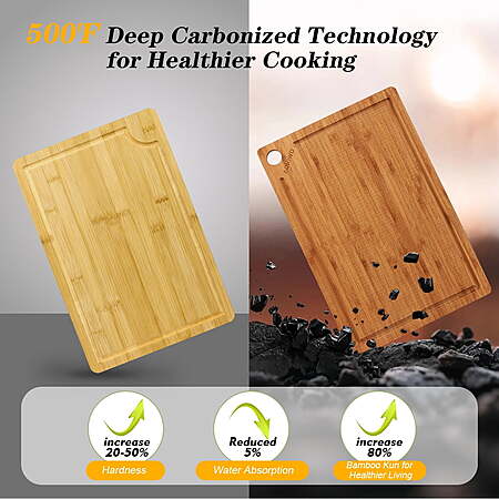 • ๐”๐ฉ๐ ๐ซ๐š๐๐ž ๐๐š๐ฆ๐›๐จ๐จ ๐‚๐ฎ๐ญ๐ญ๐ข๐ง๐  ๐๐จ๐š๐ซ๐๐ฌ - Our cutting boards undergo a thermal treatment at 500ยฐF (260ยฐC), a process known as carbonization. This treatment enhances the bamboo's stability, significantly reduces moisture absorption, and gives the board a rich, dark hue that complements any kitchen dรฉcor.