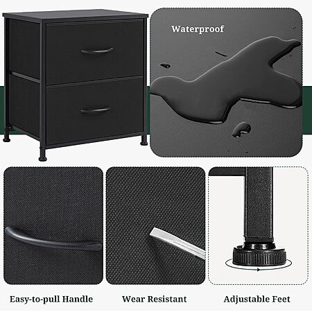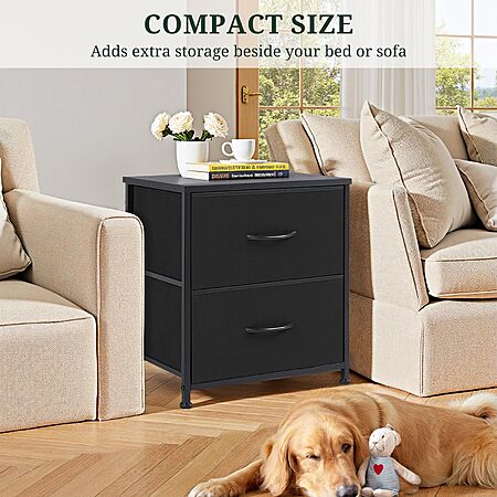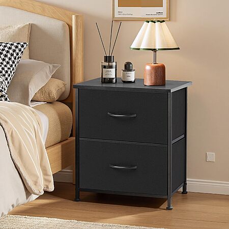Amazon.com has Nightstand, Small 2 Drawer Dresser End Table Bedside Furniture, Wooden Top Fabric Bins for Bedroom, Closet, Entryway, Dorm, 11.8" D x 18" W x 20", Black on sale for $16.18. Shipping is free w/ Prime or on $35+ orders.