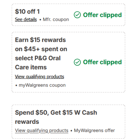 - $15 Walgreens Cash reward for spending $50+ on select P&G oral care (automatic)