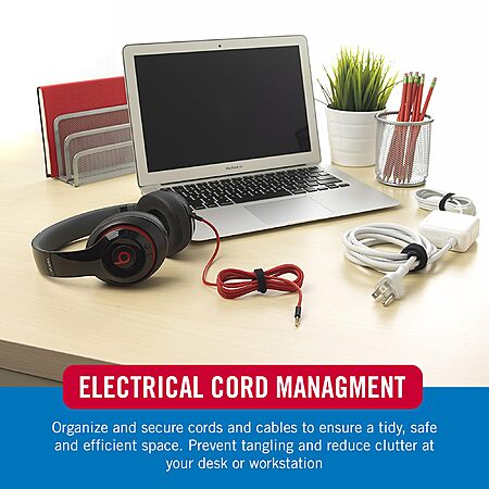 • ELECTRICAL CORD MANAGEMENT: Organize and secure cords and cables to ensure a tidy, safe and efficient space. Prevent tangling and reduce clutter at your desk or workstation