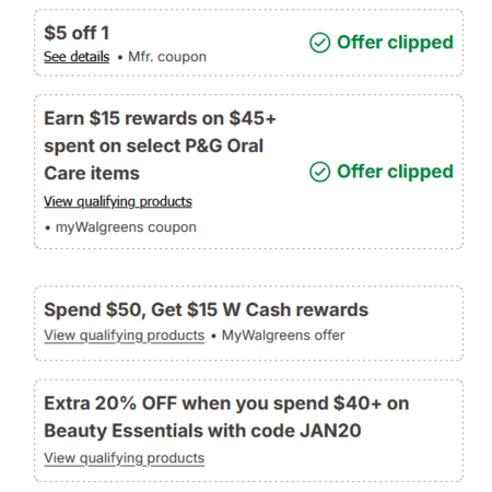 - $15 Walgreens Cash reward for spending $50+ on select P&G oral care (automatic)