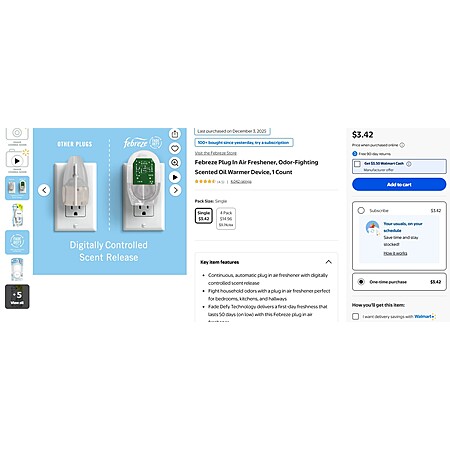 $3.5 WM Cash + Febreze Plug In Air Freshener, Odor-Fighting Scented Oil Warmer Device, 1 Count $3.42