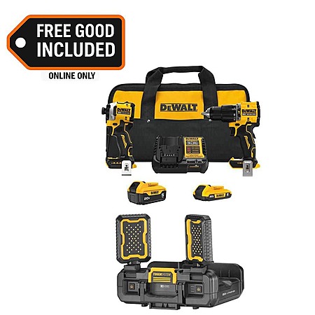 • DCK200D1P1: Tackle tough jobs in tight spaces with the ATOMIC 20-Volt MAX Hammer Drill/Impact 2-Tool Combo Kit. This kit features our shortest 20-Volt MAX hammer drill, the ATOMIC 20-Volt MAX Brushless Cordless 1/2 in. Hammer Drill (DCD799), an ATOMIC 20-Volt MAX Brushless Cordless 3-Speed 1/4 in. Impact Driver (DCF850), (2) DEWALT 20-Volt MAX batteries and a charger. This combo kit helps you complete your work in hard-to-reach areas. DWST08062: Illuminate work areas with the DEWALT TOUGH SYSTEM 2.0 Adjustable Work Light. Powered by a DEWALT 20-Volt MAX batteries (sold separately), this modular lighting solution features 2 pivoting LED heads that provide up to 3 hours of runtime. As a part of the TOUGH SYSTEM 2.0 lineup, this solution is constructed with an integrated folding handle, a durable design, and compatibility with other TOUGH SYSTEM 2.0 products (cord sold separately). Includes DCK200D1P1 and DWST08062.