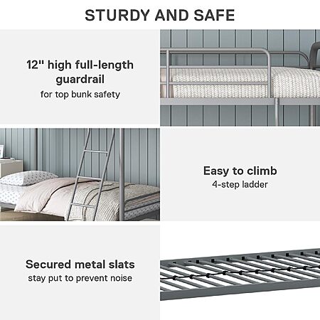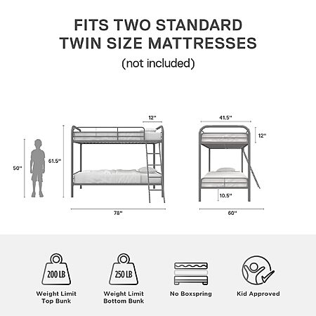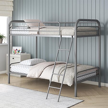 Model: DHP Twin-Over-Twin Bunk Bed with Metal Frame and Ladder, Space-Saving Design, Silver