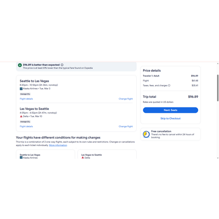 Southwest, Delta, Alaska Airlines and Expedia have round trip airfares travelling to and from Las Vegas (LAS) and Seattle (SEA) for $97, nonstop. These are basic economy fares that allow a personal item and a carry-on bag. There is no seat selection and no change.