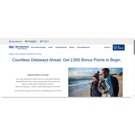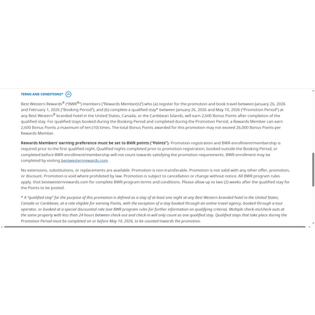 Best Western Rewards® ("BWR®") members ("Rewards Member(s)") who (a) register for the promotion and book travel between January 26, 2026, and February 1, 2026 ("Booking Period"), and (b) complete a qualified stay* between January 26, 2026 and May 10, 2026 ("Promotion Period") at any Best Western branded hotel in the United States, Canada, or the Caribbean Islands, will earn 2,600 Bonus Points for after completion of the qualified stay. For qualified stays booked during the Booking Period and completed during the Promotion Period, a Rewards Member can earn 2,600 Bonus Points a maximum of ten (10) times during the Promotion Period. The total Bonus Points awarded for this promotion may not exceed 26,000 Bonus Points per Rewards Member.