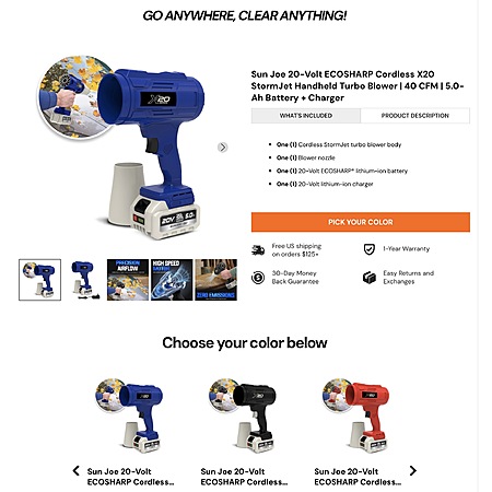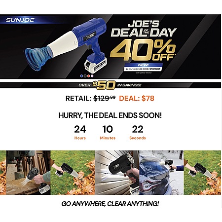 Shopjoe.com Deal of the Day 40% Off Sun Joe 20-Volt ECOSHARP Cordless X20 StormJet Handheld Turbo Blower $78