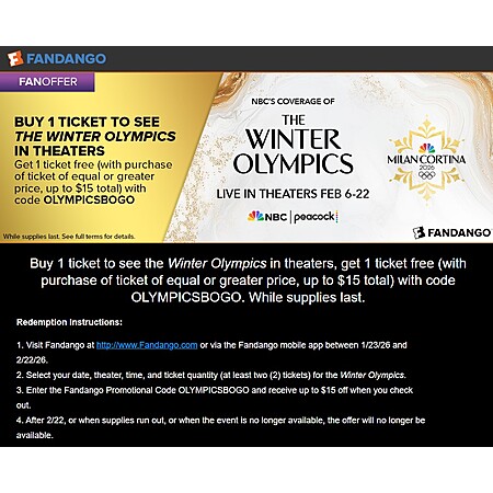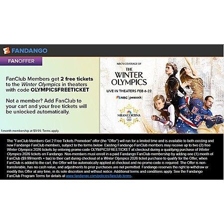 Fandango Fan Club Members: 2 Free tix to NBC's Olympics coverage in theaters w code