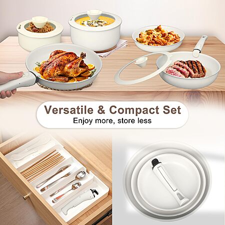 - 13-Pcs Versatile Set for All Cooking Needs: This nonstick cookware set includes 6.3"" saucepan with lid, 7.87""casserole with lid, 7.87"" fry pan, 9.45"" fry pan with lid, 11"" deep fry pan with lid, 2 detachable handles, and 2 silicone covers. Perfect for frying, simmering, steaming, or searing—ideal for home cooks, small families.