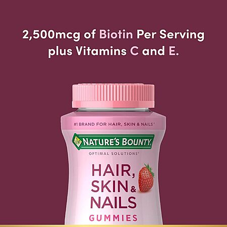 Amazon [amazon.com] has 80-Count Nature's Bounty Optimal Solutions Hair, Skin & Nails Vitamin Gummies w/ Biotin (Strawberry, 2500 mcg) on sale for $4.99 - 25% off when you 'clip' the coupon [amazon.com] on product page - 5% off when you checkout via Subscribe & Save = $3.49. Shipping is free w/ Prime or on orders $35+.