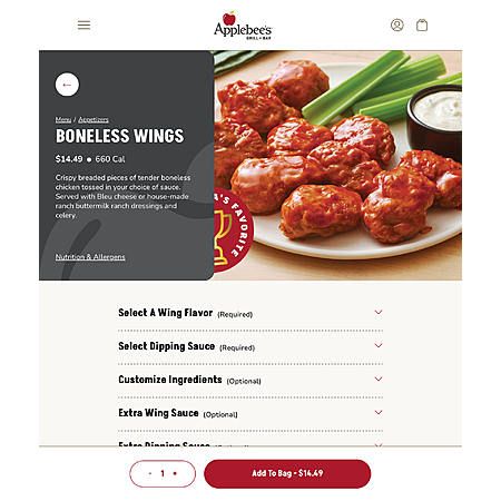 Applebee's Boneless Wings are crispy breaded pieces of tender boneless chicken tossed in guests' choice of sauce, including Classic Buffalo, Honey BBQ, Sweet Asian Chile, Garlic Parmesan, Extra Hot Buffalo and Honey Pepper. The fan-favorite dish comes complete with choice of Bleu cheese or house-made buttermilk ranch dressing."