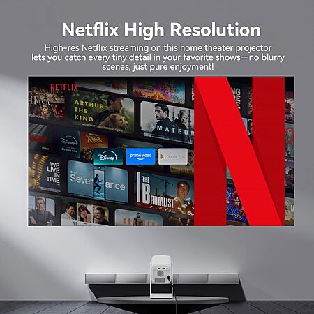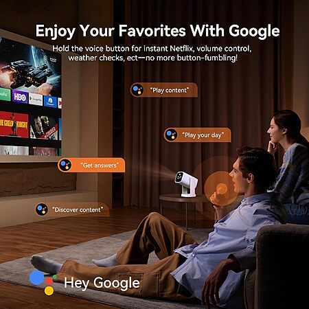 - Google Voice Assistant: Enjoy hands-free smart movie nights! Just press and hold the voice button to quickly open Netflix, search for a movie, adjust the volume, or check the weather, ect-no more button-fumbling. This home theater projector lets you conveniently cast everything you want onto the big screen anywhere.