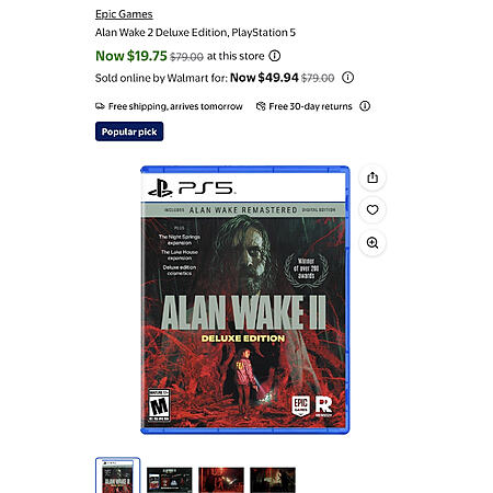 Description: Massive clearance find at Walmart! The Alan Wake 2: Deluxe Edition is ringing up for just $19.75 at various locations. This is a huge drop from the $80 MSRP.