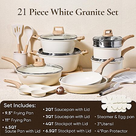 CAROTE 21Pcs Pots and Pans Set, Nonstick Cookware Sets, White Granite Induction Cookware Non Stick Cooking Set w/Frying Pans & Saucepans(PFOS, PFOA Free) $124.99