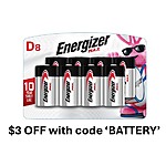Woot! has 8-Pack Energizer Max D Alkaline Battery Pack on sale for $9.99 - Extra $3 Off w/ coupon code BATTERY (apply at checkout) = $6.99. Shipping is free for Amazon Prime Members (must login with your Amazon account and select a shipping address in order for Woot to apply free shipping) or is otherwise $6 per order.