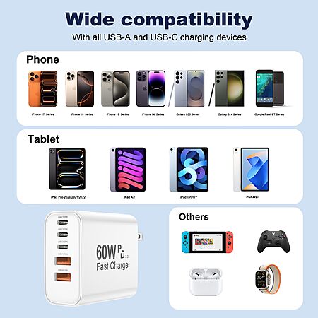 Model: USB C Charger Block, 5 in 1 Single 25W Max iPhone Charger, PD 3.0 60W Charging Blocks, QC 2A USB Wall Charger for iPhone 17 16 15 14 13 12 Pro Max, iPad, iPod, Samsung, AirPods Pro, Apple Watch Series