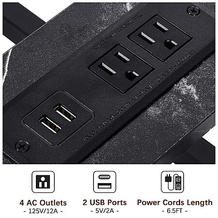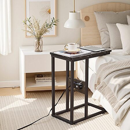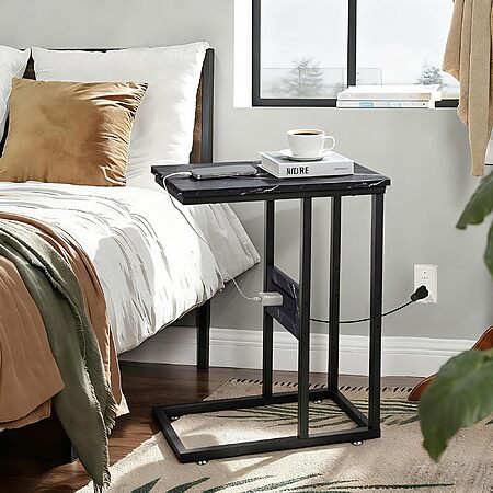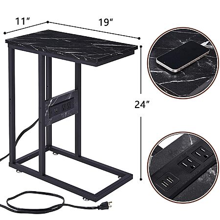 - Up-grade Power Outlets & charge Station; This c shaped end table is equipped with 2 x USB Ports & 2 x 3-Prong Power Outlets,which could charge 4 devices simultaneously. 6.5 ft power supply cord also provides great convenience, open frame design could avoid overheating electronics and provides ease of access for cables.