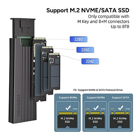 Model: MEANHIGH M.2 NVME SATA SSD Enclosure, Tool-Free USB 3.2 Gen 2 10Gbps NVME to USB Adapter, Supports M and B&M Keys External Solid State Drive Case for Size 2242/2260/2280(Up to 8TB)