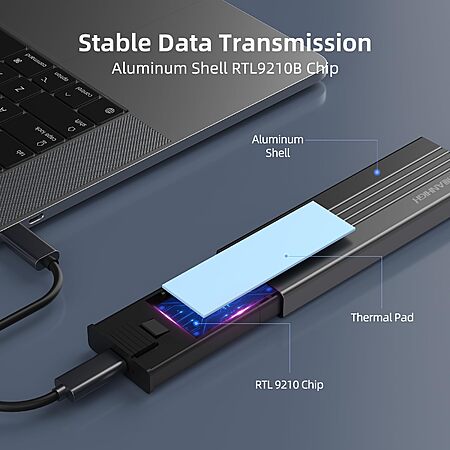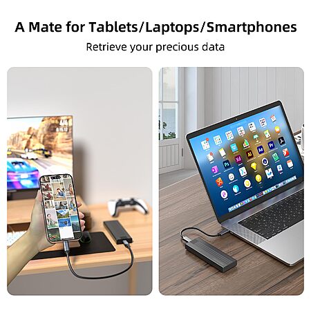 • Effective Heat Dissipation: Aluminum alloy casing ensures heat management, abrasion, and scratch resistance, extending SSD lifespan.