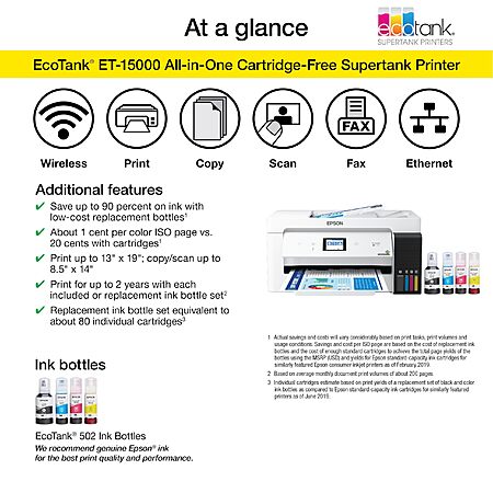 Epson EcoTank ET-15000 Wireless Color All-in-One Supertank Printer with Scanner, Copier, Fax, Ethernet and Printing up to 13 x 19 Inches, White $449.99