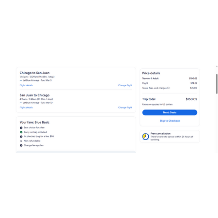 JetBlue and Expedia have round trip airfares travelling to and from Chicago (ORD) and San Juan Puerto Rico (SJU) for $150-$160, making 1 stop in New York both ways. These are basic economy fares, a restricted-type fare that only allow a personal item and a carry-on bag. There is no seat selection and no change. If you are travelling with children, JetBlue will seat your family together as per their policy.