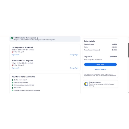 Delta Air Lines and Expedia have round trip airfares travelling from Los Angeles (LAX) to Auckland New Zealand (AKL) for $670, nonstop. These are Delta Main Extra fares that includes: seat choice, personal item, carry-on bag, 1 free checked bag, refunds and free changes (only pay for fare difference).