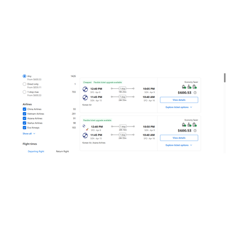 Korean Air/Asiana Airlines via Booking.com have round trip airfares travelling from San Francisco (SFO) to Ho Chi Minh City Vietnam (SGN) for $601, making 1 stop in Seoul, Korea both ways. Stopovers range from 1-10 hours, so plan ahead and maybe see Seoul for a few hours. You may have a personal item, a carry-on bag and 1 free checked bag. There is no seat selection.
