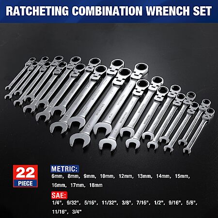 WORKPRO 22-Piece Ratcheting Wrench Set, Flex-Head Ratchet Combination Wrench Sets with Organizer Box, 72 Teeth, Metric 6-18mm & SAE 1/4-3/4" on sale for