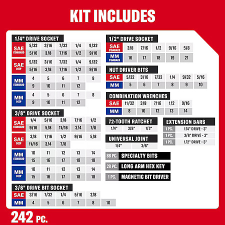 - Comprehensive Mechanics Set - Contains a full assortment of SAE and metric sockets, ratchets, wrenches, and specialty bits for automotive enthusiasts and mechanics