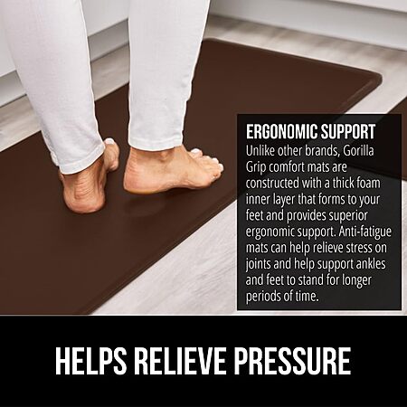 - HELPS RELIEVE PRESSURE AND FATIGUE: unlike other brands, Gorilla Grip comfort mats are designed with a thick foam inner layer that forms to feet and provides superior ergonomic support; antifatigue mats can help relieve stress on joints and help support ankles and feet to stand for longer periods of time