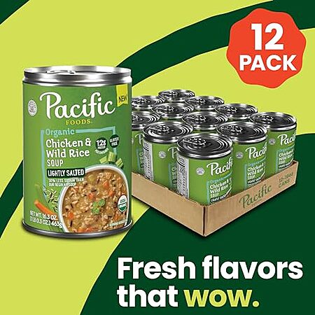 [S&S] $18.19 | 12-Pack 16.3-Oz Pacific Foods Organic Lightly Salted Chicken and Wild Rice Soup at Amazon ($1.52 each)