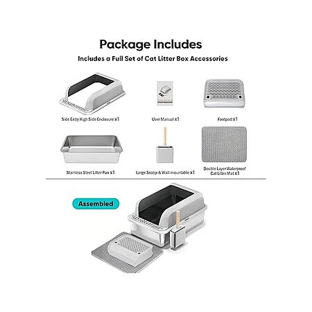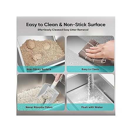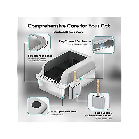 - Urine Leak Prevention: The reinforced plastic cat litter box enclosure securely clasps onto the stainless steel box, preventing urine leakage and litter splashing. The overlap design keeps everything contained, even when your cat digs or jumps out.