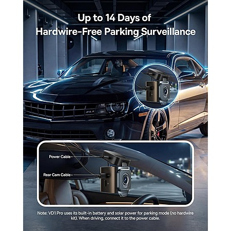 • Solar & Battery Parking Protection: Up to 14 days of parking mode protection (for event-triggered recording only) without a hardwire kit