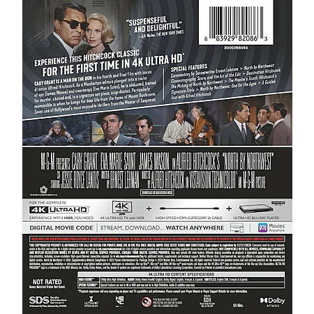 Alfred Hitchcock and Cary Grant teamed up for the fourth and final time in this landmark Hollywood suspense tale. Manhattan ad exec Roger Thornhill (Grant) is accidentally thrust into a world of international espionage as he's chased by criminals, is framed for murder, shares a train ride with a mysterious blonde, gets dusted by a crop plane, and hangs from the faces on Mount Rushmore. Eva Marie Saint, James Mason, Leo G. Carroll, Martin Landau co-star. 136 min. Widescreen; Soundtrack: English. Warner Home Video - North by Northwest [ULTRA HD] Movies Warner Home Video PG