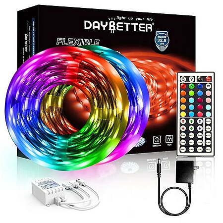 | Product Description: | Add Color to Your Bedroom Want to transform the way you light a room? Add more ambiance to your bedroom or just backlight your TV monitor? Add some color to your space with LED Light Strip. This color-changing LED Light Strip features vibrant diffused light and spans a length of 32.8 feet/10M and and comes with a 44 key IR remote to control the power, colors, and brightness of your lights. The Daybetter LED light strip is dimmable . The Remote gives you the control of color, brightness, speed, and color-changing modes for all of your strip lighting. DAYBETTER LED Strip Light 32.8ft 5050RGB Color Changing,with 44 Key Remotewith and 12V Power Supply,for Bedroom,Kitchen,Bar,Party ①Strong self adhesive: The led strip lights has a stronge self adhesive so they stick very well on TVs, cars, cabinets and walls; Please test the led strip lights before installation, every roll lights has one connector to link with controller box, so they should be attached in parallel, not in series ②Colorful and durable: The infrared remote can adjust multiple colors, including rgb, white, 16 other colors and their brightness; With 6 dynamic modes (auto, flash, jump3, jump7, fade3, fade7) and 2 speed modes (quick, slow) by remote, you can make the light strip show varieties of different color changes; Use the DIY buttons to save 6 colors if you like ③Cuttable and linkable: Our 32.8 feet led lights strip have 300 leds, it can be cut every 3 LEDs along the cutting marks if you don't need such a long lights or you could extral connectors to extend the lights for your bedroom, TV, desk, computer indoor ④Remote contol: You can use the infrared remote control to remotely control the light strip to suit the mood of the room easily; You can set it according to different scenes until you are satisfied ⑤Widely use: The led lights are suitable for bedroom, kitchen, cabinet, car, living room, party or wedding Daybetter is an industry leader in LED lighting décor Strong self-adhesive: The led strip lights have a strong self adhesive so they stick very well on TVs, cars, cabinets, and walls; Please test the led strip lights before installation, every roll light has one connector to link with the controller box, so they should be attached in parallel, not in series Cuttable and linkable: Our 32.8 feet led lights strip have 300 LEDs, it can be cut every 3 LEDs along with the cutting marks if you don't need such a long light or you could extra connectors to extend the lights for your bedroom, TV, desk, computer indoor Remote control: You can use the infrared remote control to remotely control the light strip to suit the mood of the room easily; You can set it according to different scenes until you are satisfied Widely use: The led lights are suitable for bedroom, kitchen, cabinet, car, living room, party or wedding The color changing led strip is non-waterproof, which is designed to be used indoor Colorful and durable: The infrared remote can adjust multiple colors, including RGB, white, 16 other colors and their brightness; With 6 dynamic modes (auto, flash, jump3, jump7, fade3, fade7) and 2-speed modes (quick, slow) by remote, you can make the light strip show varieties of different color changes; Use the DIY buttons to save 6 colors if you like |