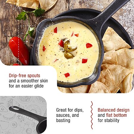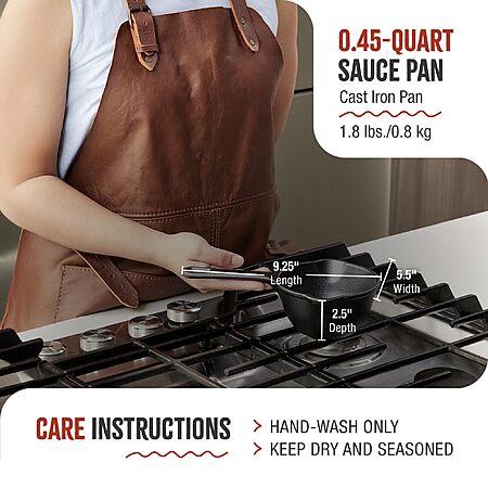 - CAST IRON COOKWARE: This cast iron cooking pot is made with durable cast iron that has excellent heat retention and a long ergonomic handle. The 0.45-quart size is great for dips and sauces, while the 2-quart size is ideal for soup or fondue.