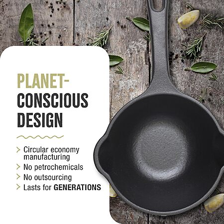 - SPECIAL CARE: This cast iron pan is made with natural materials without synthetic coatings or processes. Our cookware requires special use and care and should never be air-dried or put in a dishwasher. Follow the included instructions for proper care.
