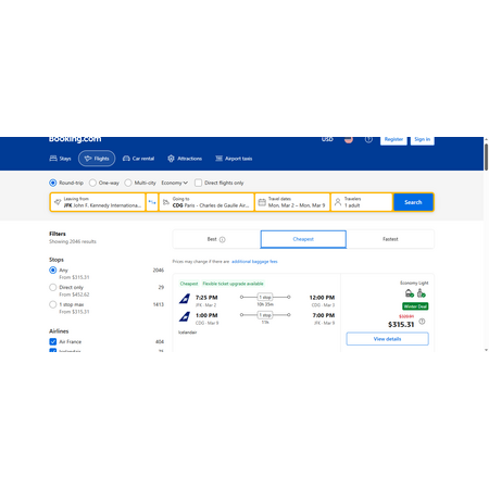 Icelandair via Booking.com have round trip airfares travelling from New York (JFK) to Paris France (CDG) for $316, making 1 stop in Iceland for a couple of hours, both ways. These are basic economy fares that allow a personal item and a carry-on bag. There is no seat selection and no change.
