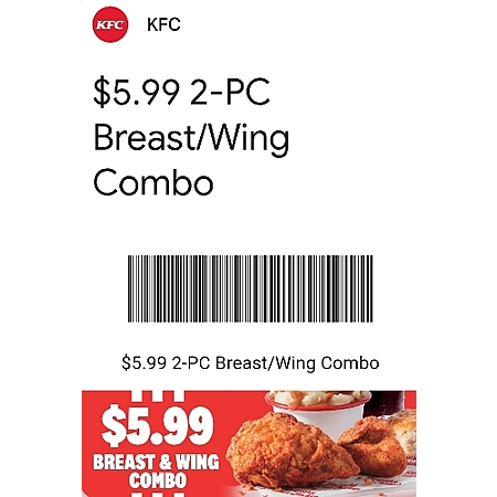 KFC's 2-PC Breast/Wing Combo (w/ ind. side, biscuit & med drink) is ONLY $5.99 w/ coupon attached! Exp. Mon, 2/2.