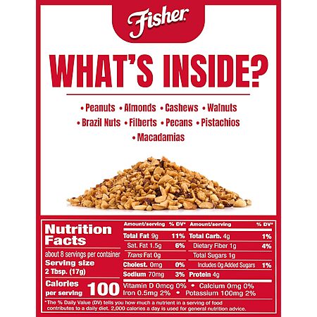 Model: Fisher Mixed Nuts Ice Cream Topping, 5 oz, Peanuts, Almonds, Cashews, Walnuts, Brazil Nuts, Filberts, Pecans, Pistachios & Macadamias, Gluten-Free, No Added Sugars, Ice Cream, Yogurt, Salad Toppings