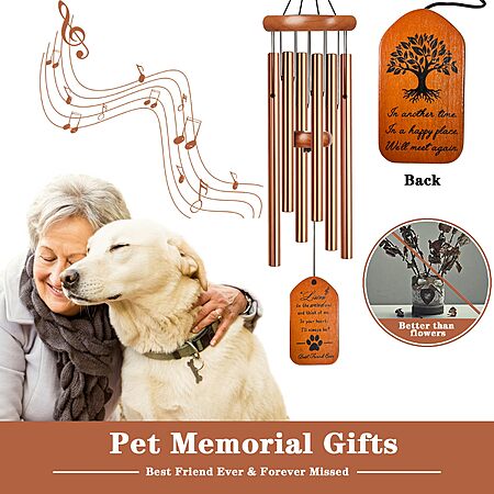 Product Description from Amazon:- Soothing Dog Memorial Wind Chimes: When the breeze blows the windcatcher and drives the aluminium tube to resonate, we will hear the deep tone. It sends out a soothing and elegant melody is a pleasure, the atmosphere is intoxicating and it can relax our body and mind.A heartwarming way comfort and healing to pet owners.