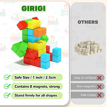 - Creative Montessori Educational Toys: Foster spatial imagination and architectural design skills in kids aged 3-5 with our magnetic blocks. Inspire your toddler's creativity and learning potential as they build a world of shapes and structures with these magnetic blocks. Girigi magnet toys help kids' develop spatial awareness, logical thinking, and color coordination skills. Perfect magnetic cubes toys as preschool toys, classroom must haves
