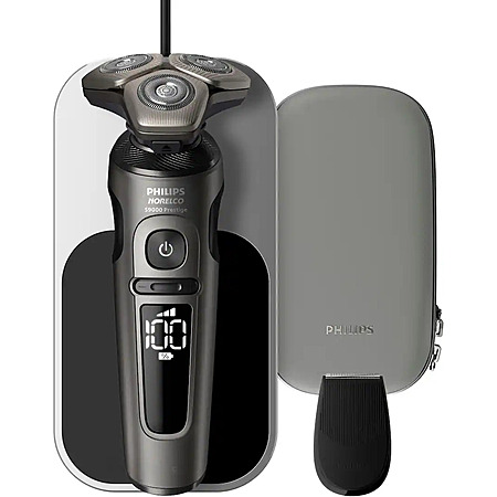 Experience the world's closest electric shave and uncompromised skin comfort with Philips Norelco S9000 Prestige with wireless Qi-charging. Dual SteelPrecision blades are strengthened with nano particles and have extra strong and long-lasting sharp edges to cut hair with the highest precision for the closest results. Our excellent skin comfort system enables you to effortlessly get a highly efficient shave, even on a longer (up to 7-day) beard. Its new wider, rounder openings catch more hair per pass, resulting in a difference you can feel. The Smart Hair Sensor checks hair density 500 times per second and automatically adapts the shaver to your hair. Choose between 3 modes to customize your shave: 1) Comfort - for a gentle, thorough shave. 2) Dynamic - for a thorough, everyday shave. 3) Efficiency - for a quick shave that saves you time. Get a convenient dry shave or a more refreshing wet shave with gel or foam - even in the shower. Finish your look with the skin-friendly click-on precision trimmer. It is ideal for maintaining your mustache and trimming your sideburns. The premium pouch protects the shaver as well as its accessories and wireless Qi charging pad. Its thoughtful design matches the timeless elegance of the shaver. Shave longer with every charge, thanks to a powerful and long-lasting Lithium-ion battery. You'll have up to 60 minutes of shaving time – that's about 21 shaves. Wirelessly charge your shaver or any other Qi-compliant device by simply placing it on the Qi charging pad. Clean the shaver easily and thoroughly under the tap. Simply open the shaving head and rinse both sides under running water to get it perfectly clean. This shaver only operates in cordless mode. For best shaving performance, replace your shaving heads every 12 months. Use SH91/52 replacement heads, sold separately.