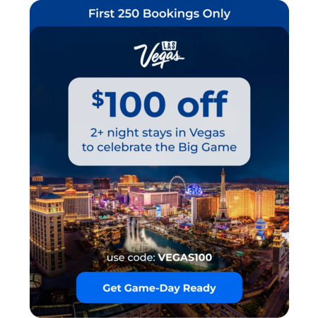 Coupon VEGAS100 is valid for $100 off select hotel stays in Las Vegas, NV. Must stay 2+ nights between Thursday 2/5 and Tuesday 2/10, 2026 for offer to apply. Coupon is subject to hotel eligibility; if there is no coupon box at checkout, booking is not eligible for coupon savings. Offer is valid to the first 250 bookings or until 2/9/26 9am EST, whichever comes first. Does not apply to taxes and fees. Must transact in USD. Sign in required.