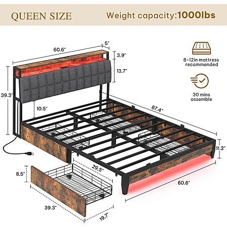 YITAHOME Upholstered Queen Bed Frame w/ RGB, 4 Drawers, Charging Station $153 @ Amazon